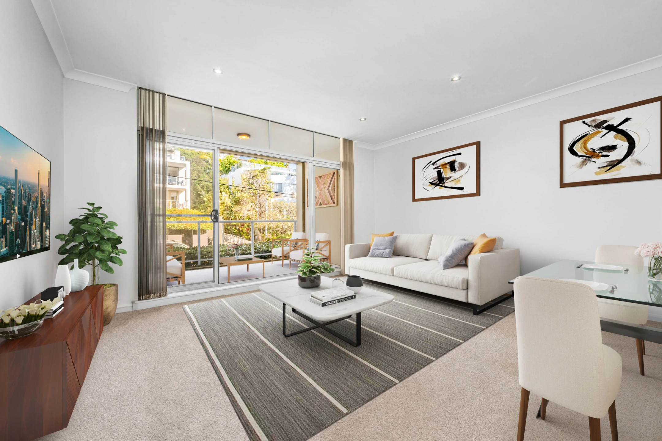| Open-plan living flows to sunny covered balcony
