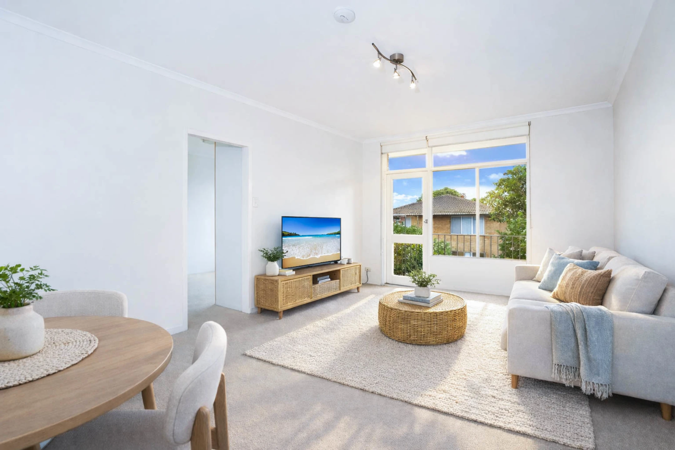 | Doors flow to sunny private balcony